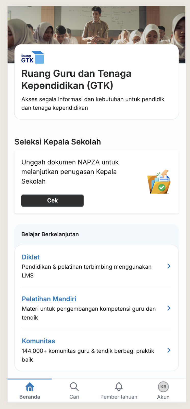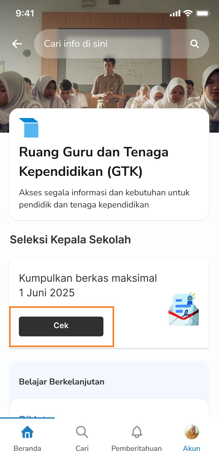 1. Klik Cek pada bagian Seleksi Kepala Sekolah di halaman Beranda Ruang GTK