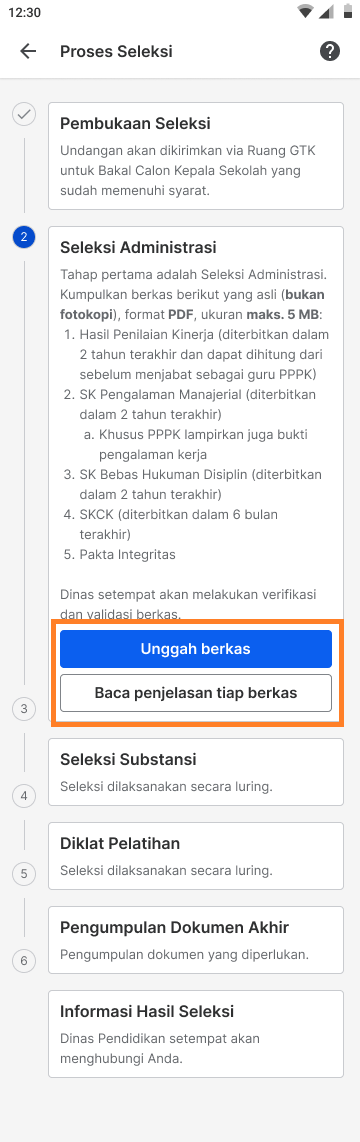 Sebagai salah satu syarat untuk mengikuti Seleksi Kepala Sekolah, Anda diwajibkan untuk mengunggah berkas yang dibutuhkan dengan lengkap. Anda dapat mengunggah berkas selama masa periode pengumpulan berkas yang sudah ditentukan. Jika Anda tidak mengumpulkan berkas pada masa tersebut maka Anda akan dinyatakan gagal seleksi secara otomatis.