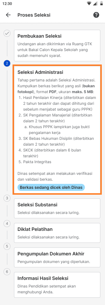 12. Ketika sudah kembali ke halaman Proses Seleksi, pada kolom Pengumpulan berkas akan terdapat keterangan Berkas sedang di cek oleh Dinas, yang menandakan bahwa Anda sudah mengumpulkan semua berkas yang diperlukan dan berkas tersebut akan dilakukan pengecekan oleh Dinas.