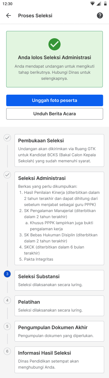 Klik Unduh Berita Acara untuk melihat berita acara dalam proses seleksi administrasi. Perlu diketahui jika Anda tidak lolos Seleksi Administrasi, maka Anda tidak bisa melanjutkan ke Tahap Seleksi Substansi.