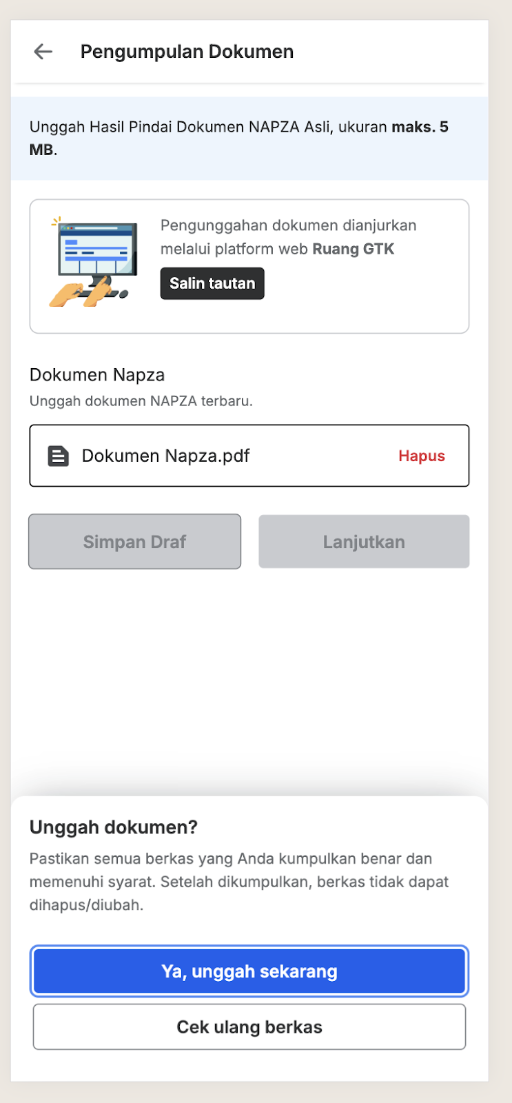 Untuk melanjutkan proses seleksi, Anda perlu mengunggah dokumen NAPZA. Berikut panduan langkah-langkahnya melalui Ruang GTK: