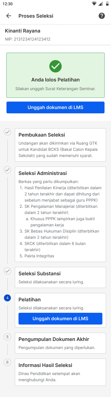 2. Selanjutnya, Anda akan diarahkan ke laman proses seleksi atau detail notifikasi. Klik tombol Unggah Dokumen di LMS, lalu sistem akan membuka laman LMS. Pastikan Anda melakukan sign-in untuk dapat mengunggah dokumen.