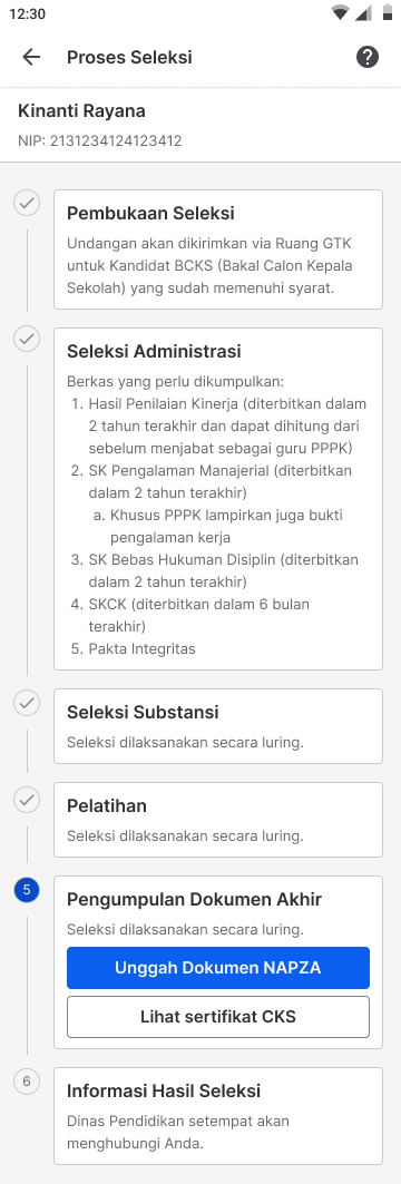 Sebagai implementasi Permendikdasmen Nomor 7 Tahun 2025, pengajuan penugasan Calon Kepala Sekolah (CKS) melalui Proses Reguler mewajibkan unggahan Surat Keterangan Seminar dan Dokumen NAPZA. Kedua dokumen ini menjadi landasan validasi administratif sebelum CKS diajukan oleh Dinas Pendidikan.