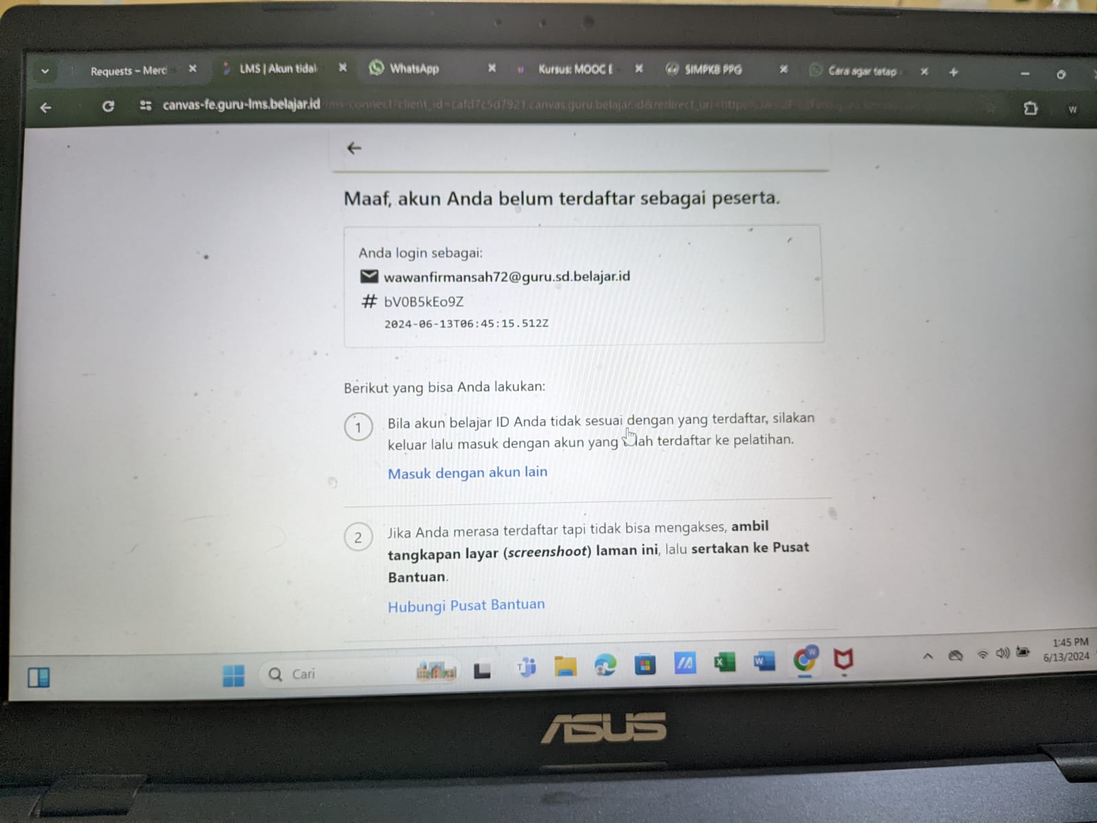 saya sudah bolak balik menghubungkan akun belajar.id saya dengan LMS tapi selalu GAGAL...keterangannya : Maaf, akun anda belum terdaftar sebagai peserta...apakah dengan tidak bisa menghubungkan akun belajar.id dengan LMS akan menimbulkan masalah ? terimakasih
