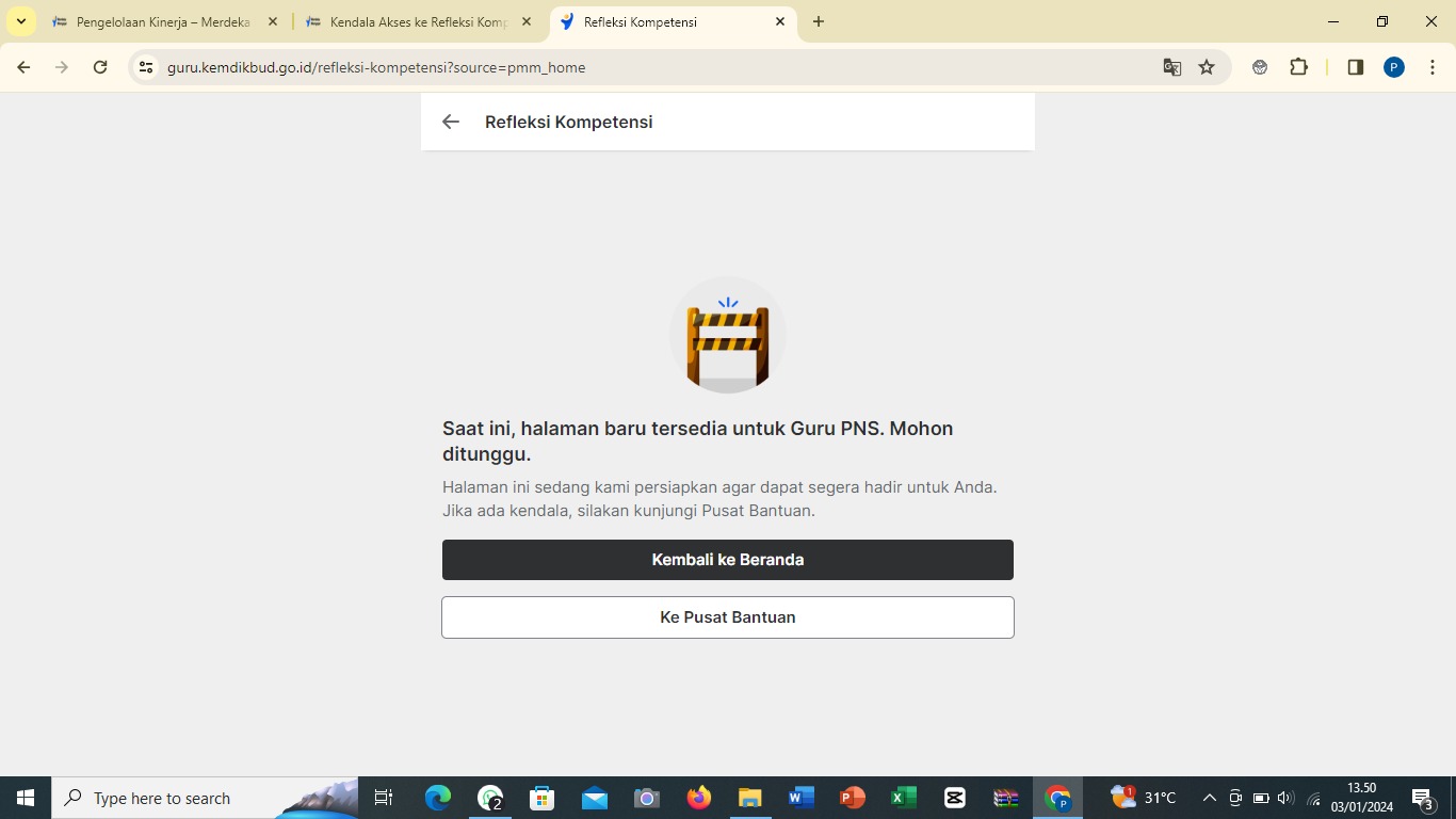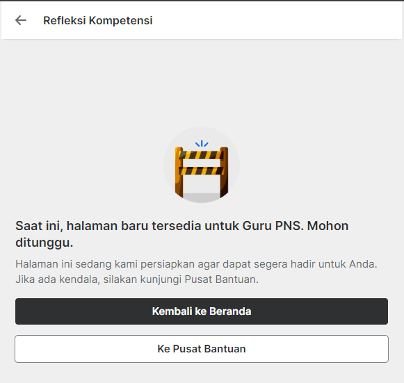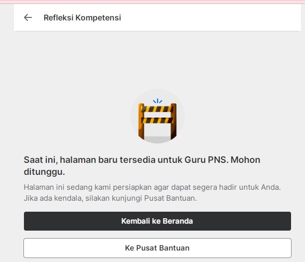 Izin bertanya, saya PNS namun tidak bisa mengakses Refleksi Kompetensi dengan keterangan "Saat ini, halaman baru tersedia untuk Guru PNS. Mohon ditunggu.". Mohon bantuannya agar saya dapat segera, mengakses Refleksi Kompetensi.