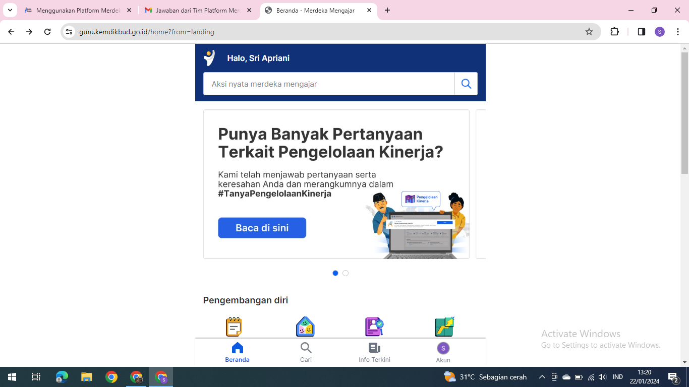 mohon maaf izin bertanya, saya guru SMP tidak bisa mengakses ke pengelolaan kinerja. Sebelumnya saya sudah terdaftar akun belajar id SD. Bagaimana solusinya untuk bisa mengakses pengelolaan kinerja memakai akun belajar id SMP?. Terimakasih