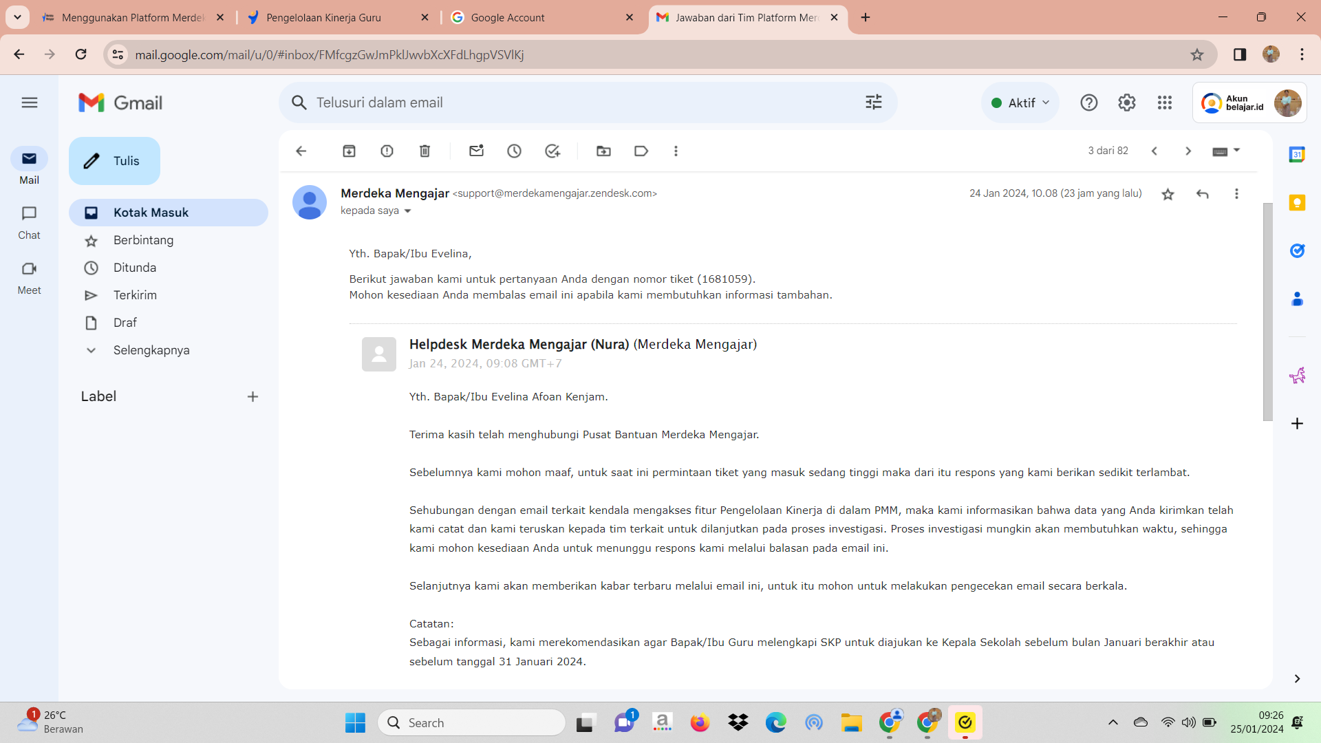 sampai sekarang masih belum bisa akses Pengelolaan Kinerja . sebelumnya pernah induk di sekolah SD tetapi sekarang sekolah saya berada di SMP, tapi website pengelolaan kinerja diminta untuk login menggunakan akun belajar yang SD. minta