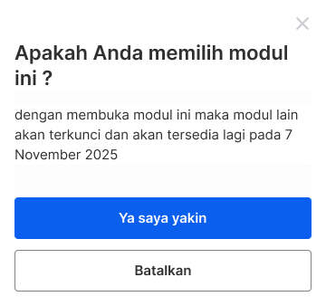 Setelah memilih modul yang ingin dipelajari, Anda akan menerima notifikasi dan permintaan konfirmasi. Jika Anda telah memilih modul yang akan dipelajari, modul lainnya akan terkunci dan baru akan terbuka sesuai jadwal yang telah ditentukan (8 Hari).