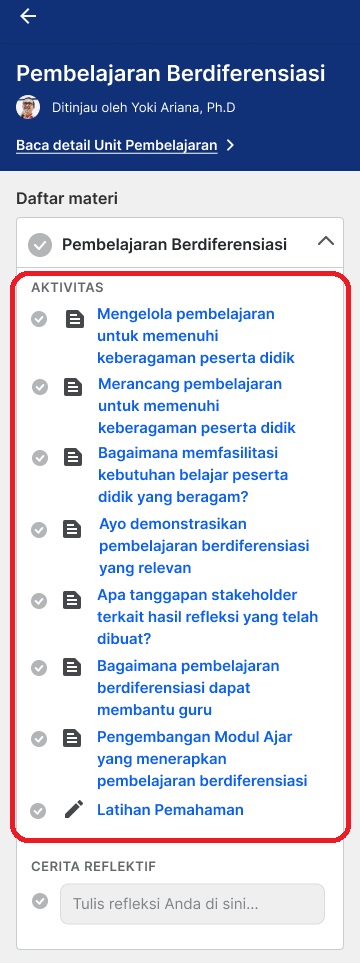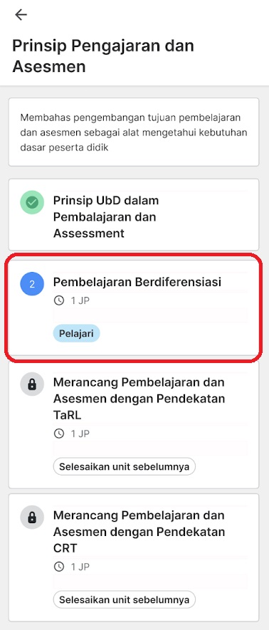 Berikut tampilan ketika Anda telah memilih modul pembelajaran. Modul lainnya akan terkunci dan baru dapat dipilih setelah Anda menyelesaikan modul sebelumnya serta masa durasi penguncian modul pembelajaran telah berakhir.