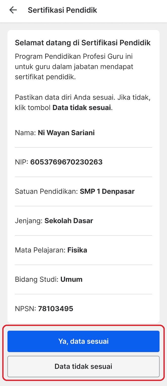 - Lakukan konfirmasi data. Pilih ‘Ya, data sesuai’ jika data sudah sesuai, ‘Data tidak sesuai’ jika data yang tertera tidak sesuai.