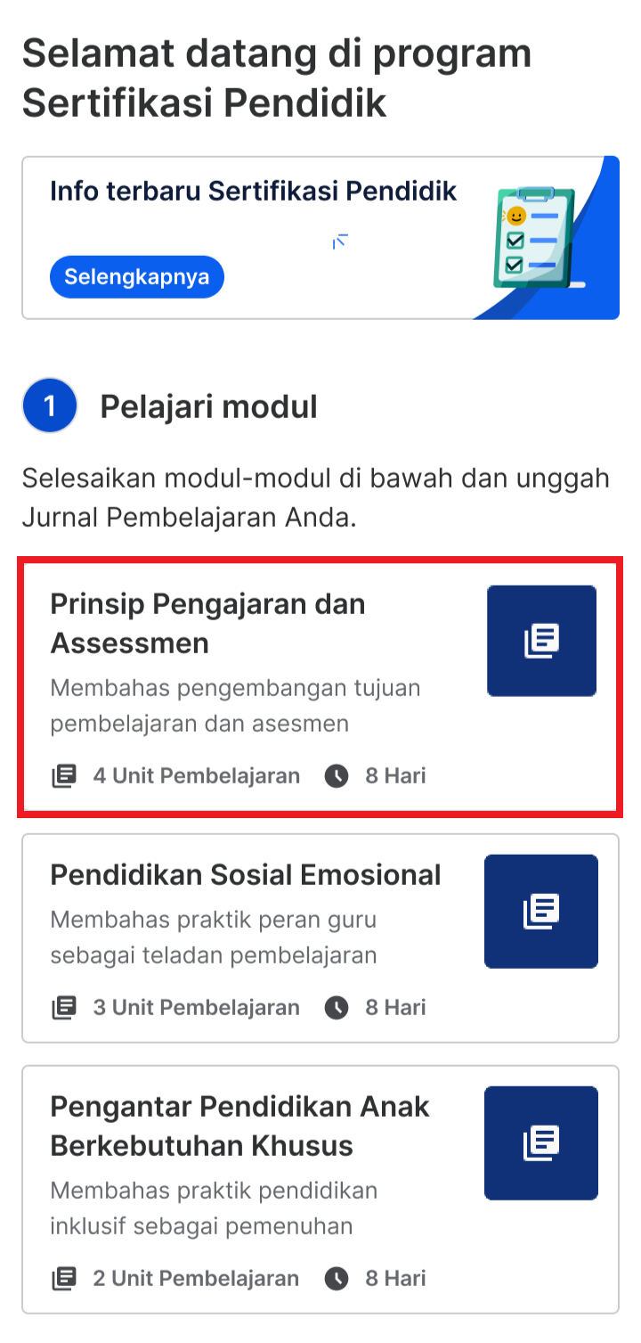 - Anda akan masuk ke laman belajar Sertifikasi Pendidik, pilih Modul untuk dipelajari.