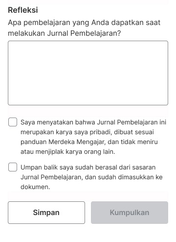 5. Masih di dalam halaman yang sama, tuliskan Refleksi pembelajaran dan centang konfirmasi yang dibutuhkan. Klik Simpan untuk menyimpan sebagai draft, klik Kumpulkan untuk melanjutkan.