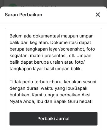 Apabila jurnal pembelajaran perlu diperbaiki, peserta akan mendapatkan saran perbaikan sebelum mengunggah kembali jurnal.
