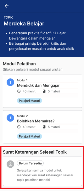 Berikut merupakan panduan untuk mengunduh Surat Keterangan Selesai Topik pada Pelatihan Mandiri: