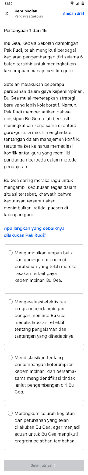 Anda dapat memulai Asesmen sesuai dengan kompetensi yang telah dipilih. Silakan jawab seluruh pertanyaan Asesmen dengan baik. Perlu diketahui bahwa jawaban yang telah dipilih tidak dapat diubah. Tidak ada jawaban yang dianggap benar atau salah, namun sangat penting untuk menjawab setiap pertanyaan dengan jujur agar hasil asesmen memberikan gambaran yang akurat dan bermanfaat bagi pengembangan pribadi Anda.