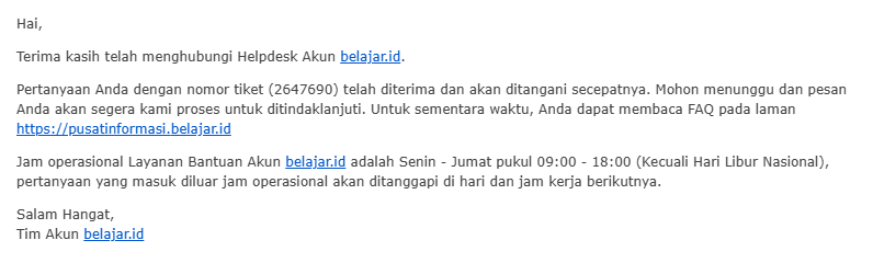 Pertanyaan dengan nomor tiket (2647690) telah diterima | Re: [Akun belajar.id saya terkena spam]