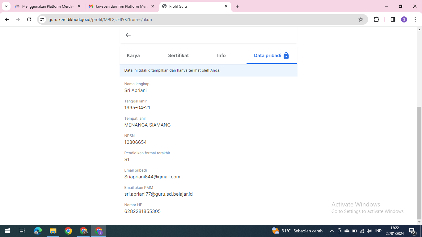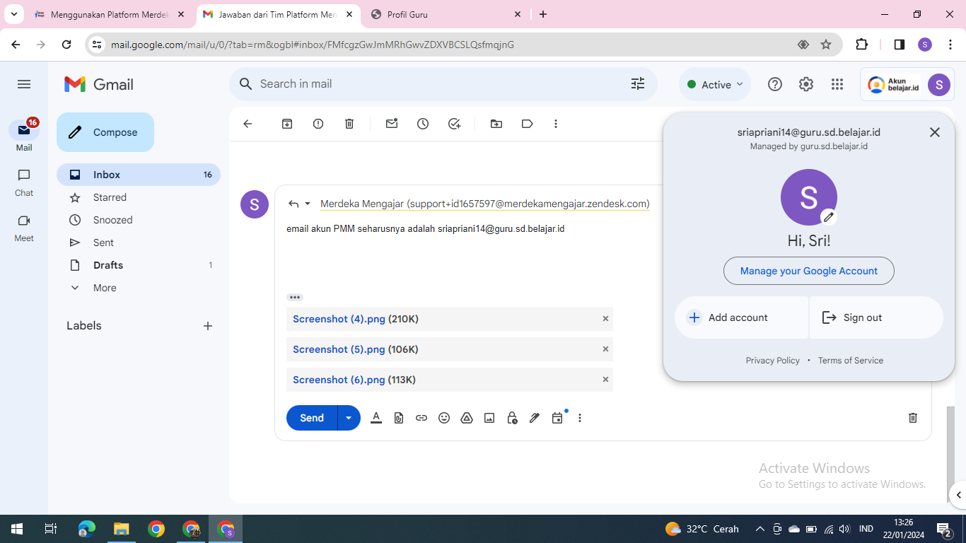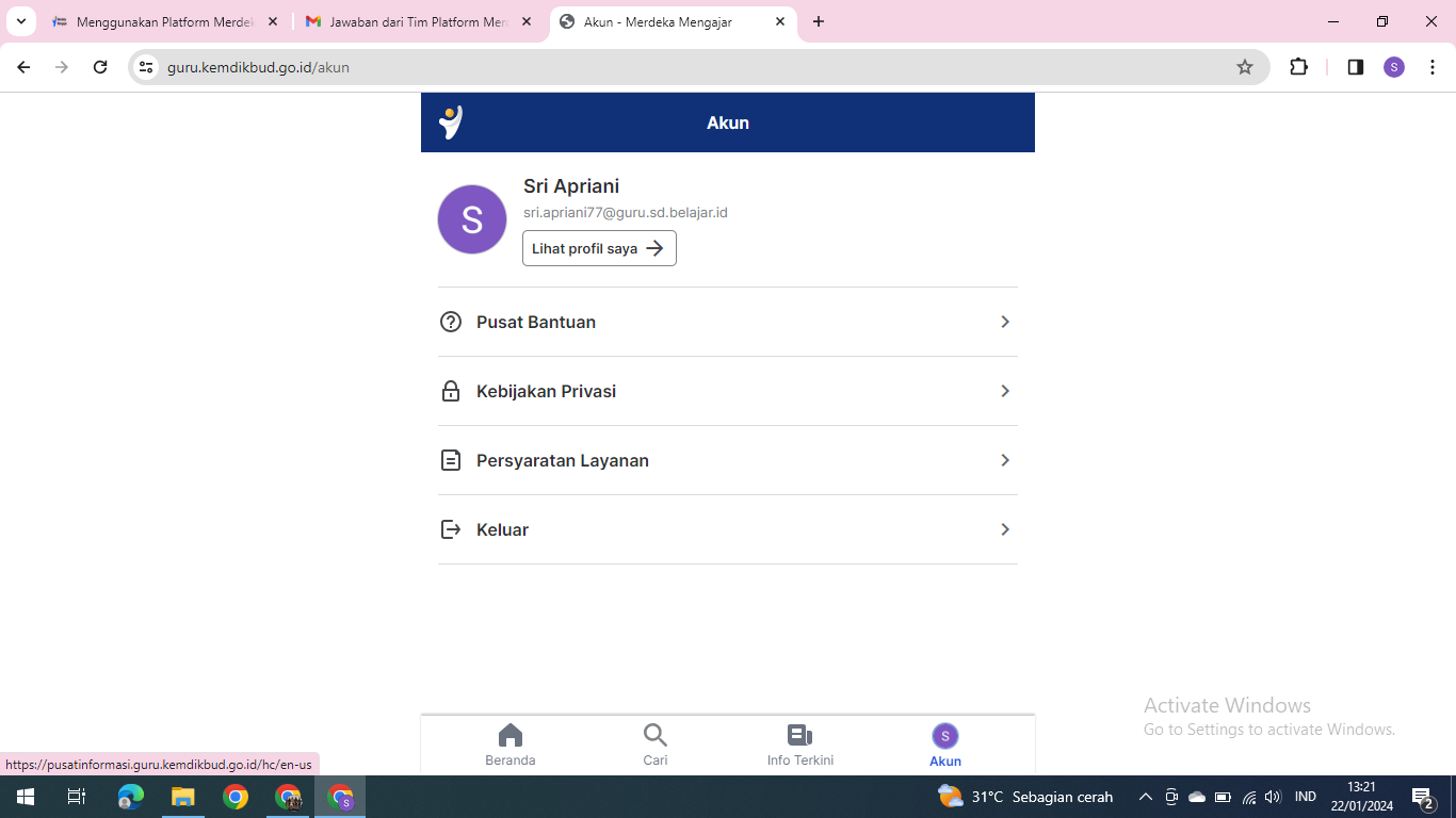 1. email akun PMM pada profil tidak sama, tidak serupa, tidak sesuai, mohon untuk diganti dari yang semula sri.apriani77@guru.sd.belajar.id menjadi akun yang seharusnya dan sebenarnya yaitu sriapriani14@guru.sd.belajar.id.