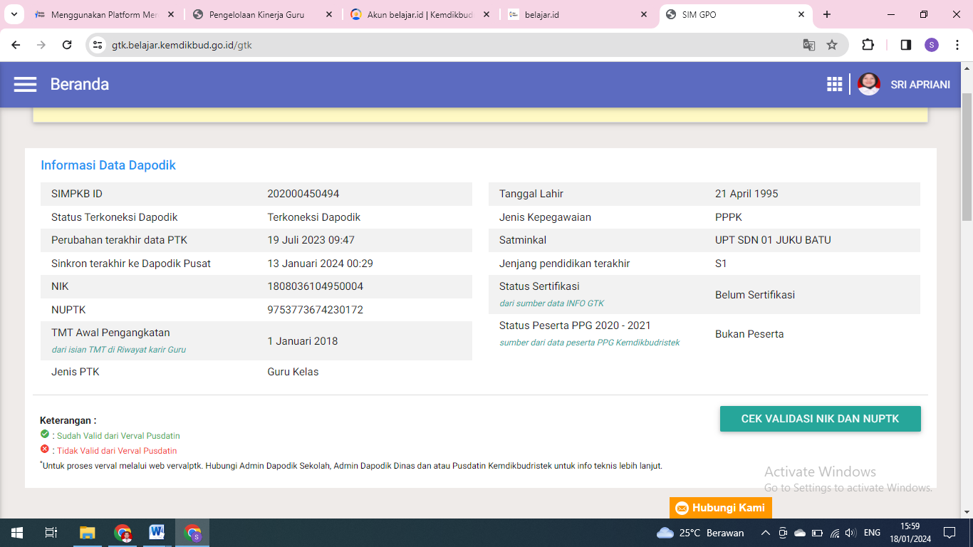 Pastikan nomor handphone yang Anda gunakan saat ini sama dengan nomor handphone yang terdaftar di Data Pokok Pendidikan (Dapodik)