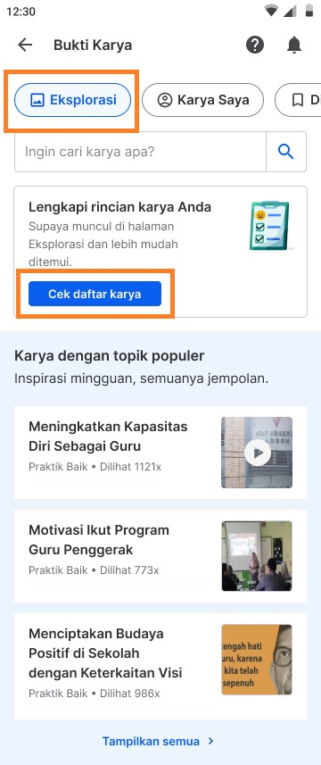 3. Bagi Anda yang belum melengkapi Jenjang, Mata Pelajaran, dan Kelas, karya yang ditampilkan tidak akan muncul pada tab Eksplorasi. Anda dapat mengklik 'Cek Daftar Karya' untuk melihat daftar karya yang perlu dilengkapi.