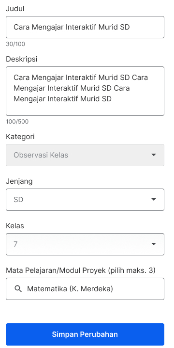 Saat ini, Anda dapat menambahkan Jenjang pada karya dengan mengubah atau mengedit rincian video atau dokumen (PDF) yang telah diunggah atau dipublikasikan. Berikut panduan untuk mengubah atau mengedit rincian bukti karya :