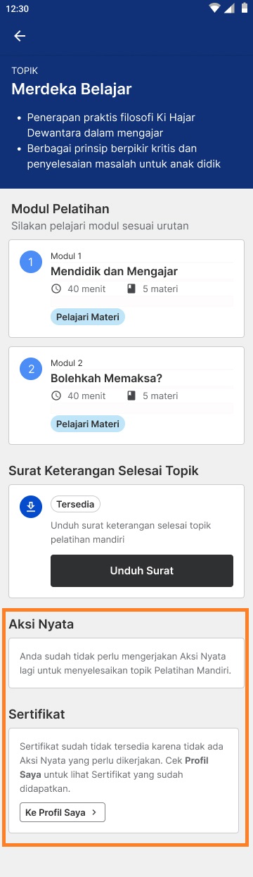 Pada tanggal 21 Januari 2025, Pelatihan Mandiri akan disempurnakan melalui mekanisme Penutupan Aksi Nyata. Untuk informasi lebih lanjut mengenai Penutupan Aksi Nyata, silakan kunjungi artikel terkait melalui tautan di sini.