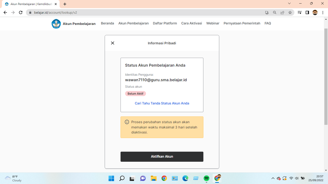 Jika Anda sudah pernah login/aktif menggunakan akun belajar.id, artinya akun Anda sudah berhasil diaktivasi. Tidak perlu khawatir, karena akun Anda telah terhitung sebagai akun yang sudah berhasil diaktivasi. Sedangkan, informasi di laman belajar.id akan terus diperbaharui secara berkala. Informasi lebih lanjut mengenai status Akun Belajar.id silakan lihat di artikel ini.
