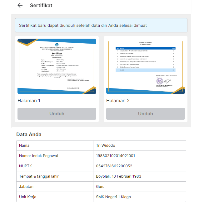Untuk saat ini, sertifikat memang tidak bisa diedit. Oleh karena itu pastikan Anda memeriksa kembali data diri sebelum menyimpan dan mengunduh sertifikat.
