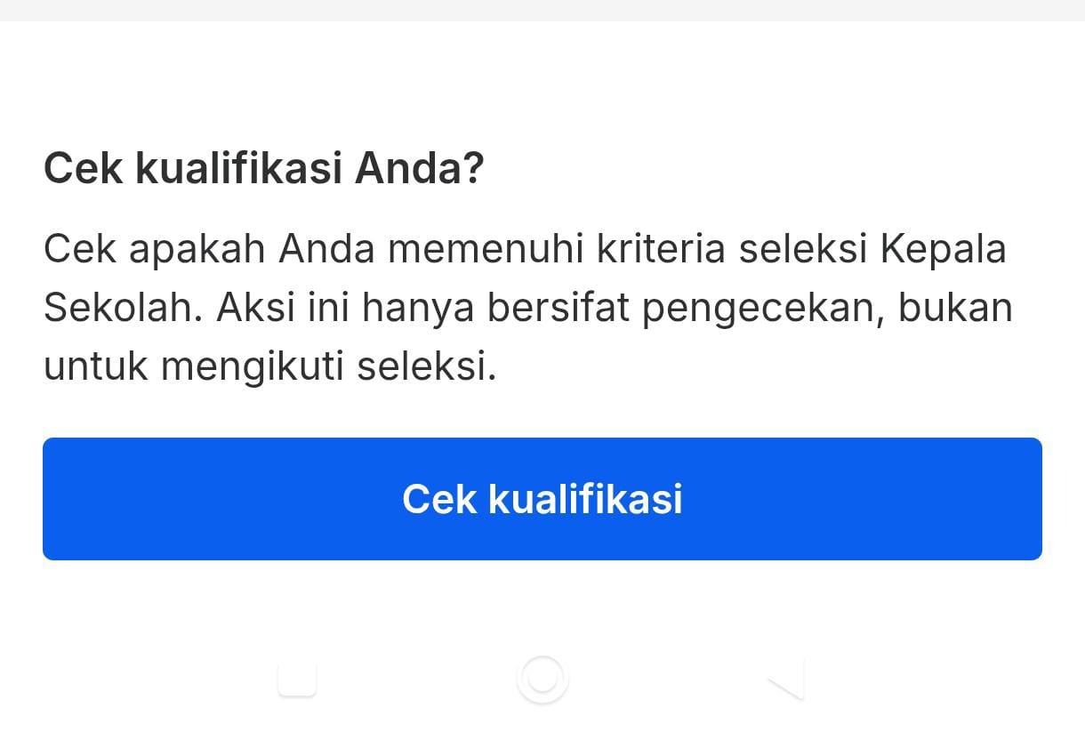 2. Gulir ke bagian bawah dan temukan halaman Cek Kualifikasi Anda?, kemudian klik tombol Cek Kualifikasi untuk mengetahui apakah Anda memenuhi kriteria Seleksi Kepala Sekolah. Perlu diperhatikan bahwa tindakan ini hanya bersifat pengecekan, bukan pendaftaran untuk mengikuti seleksi.