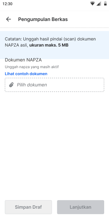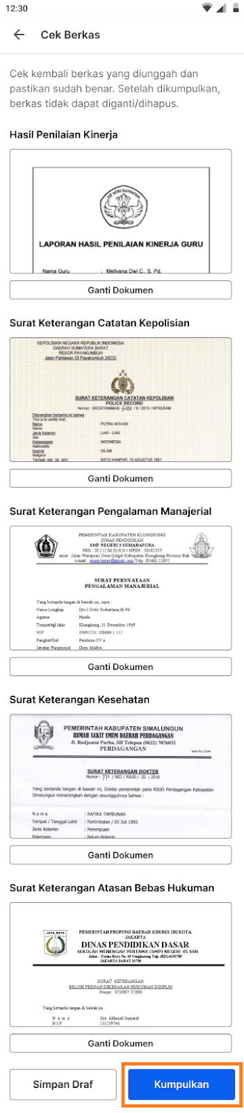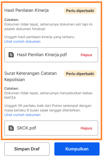 14. Anda dapat mengunggah ulang dokumen yang perlu diperbaiki. Klik Lihat contoh dokumen sebagai referensi sebelum mengunggah. Klik Kumpulkan setelah semua dokumen selesai diperbaiki.