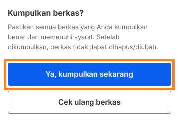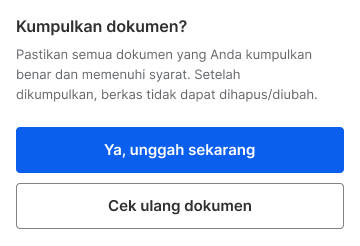 6. Kemudian, sistem akan meminta konfirmasi ulang. Klik Ya, Unggah Sekarang untuk menyelesaikan proses, atau pilih Cek Ulang Dokumen apabila Anda ingin meninjau kembali