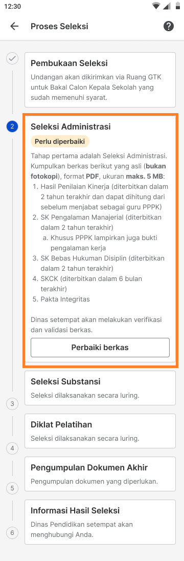 13. Jika setelah pengecekan oleh Dinas status Anda Perlu diperbaiki, Anda bisa klik Perbaiki Berkas untuk melihat dokumen apa saja yang harus disesuaikan.