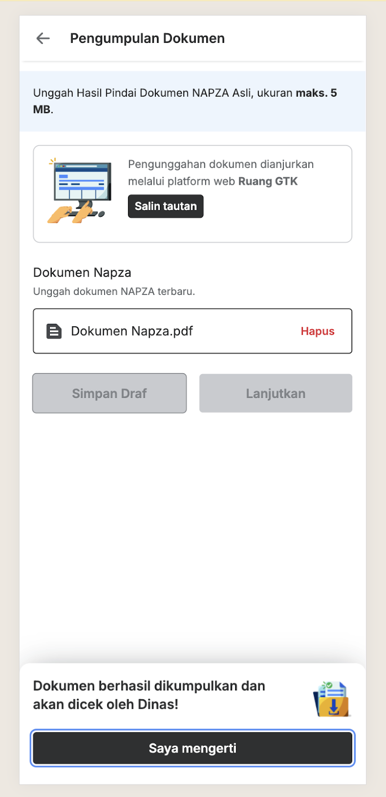 Untuk melanjutkan proses seleksi, Anda perlu mengunggah dokumen NAPZA. Berikut panduan langkah-langkahnya melalui Ruang GTK: