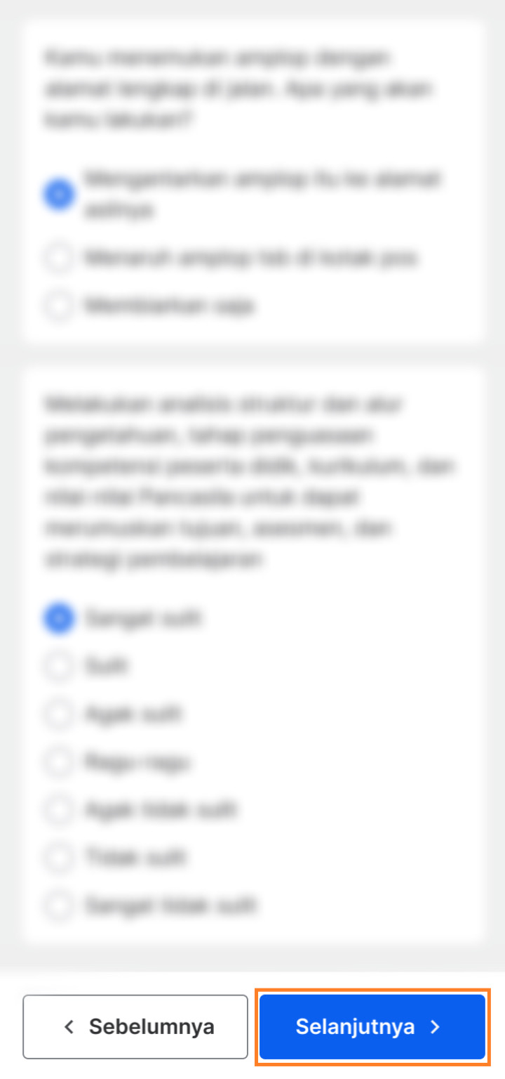 5. Silakan jawab seluruh pertanyaan Asesmen. Sehingga, Asesmen dapat sukses dikumpulkan. Klik 'Selanjutnya' untuk menjawab pertanyaan-pertanyaan lainnya.