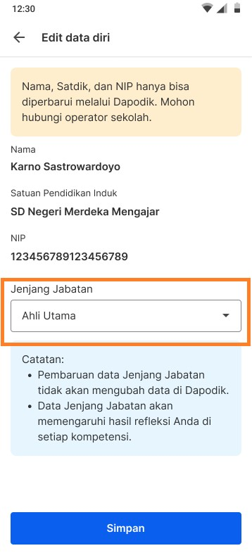3. Jika data diri Anda sudah sesuai, silakan klik 'Data sudah benar'. Namun, jika data diri Anda tidak sesuai, Anda bisa klik 'Edit'. Pengeditan data diri hanya dapat dilakukan untuk mengubah Jenjang Jabatan. Pilih Jenjang Jabatan yang sesuai, kemudian klik 'Simpan'.