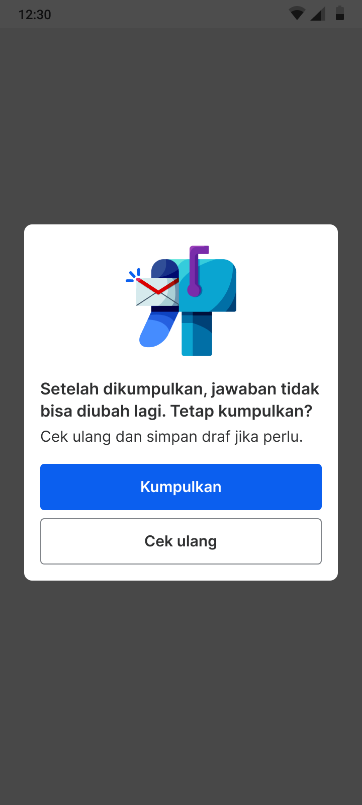 10. Kemudian akan muncul tampilan halaman pertanyaan konfirmasi seputar jawaban yang Anda sudah kerjakan. Jika Anda yakin dengan jawaban yang sudah dikerjakan, Anda bisa klik 'Kumpulkan'