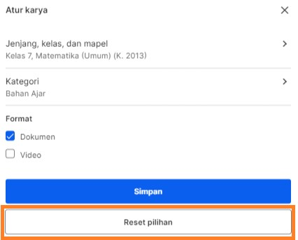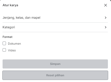 - Atur kembali preferensi karya yang Anda inginkan dengan memilih jenjang, kelas, mapel, kategori, dan format karya.