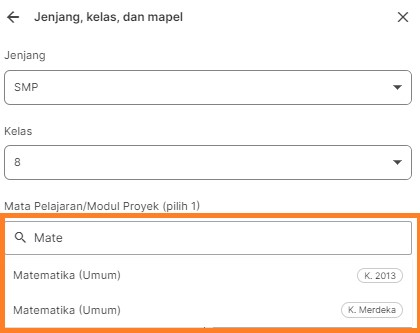 - Anda bisa melakukan pencarian mata pelajaran dengan mengetik mata pelajaran pada kolom yang tersedia. Misalnya “matematika”.