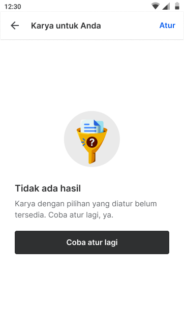 Perlu diketahui, apabila Anda menemukan tampilan “Tidak ada hasil” seperti di bawah ini, artinya karya pilihan Anda belum tersedia di Bukti Karya. Silakan ubah pilihan pengaturan karya Anda.