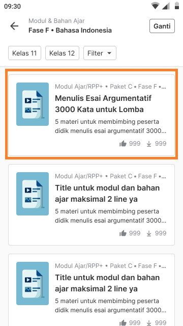 2. Kemudian, Anda bisa memilih / klik Perangkat Ajar sesuai dengan minat Anda. Misalnya Menulis Esai Argumentatif 3000 Kata untuk Lomba