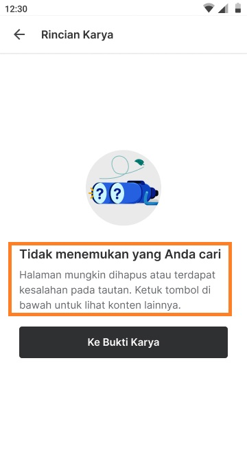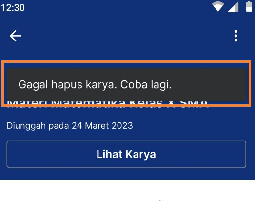 6. Jika muncul notifikasi “Gagal hapus karya. Coba lagi.”, maka karya Anda pada Bukti Karya belum berhasil di hapus, Anda bisa mengulangi kembali untuk menghapus Karya.