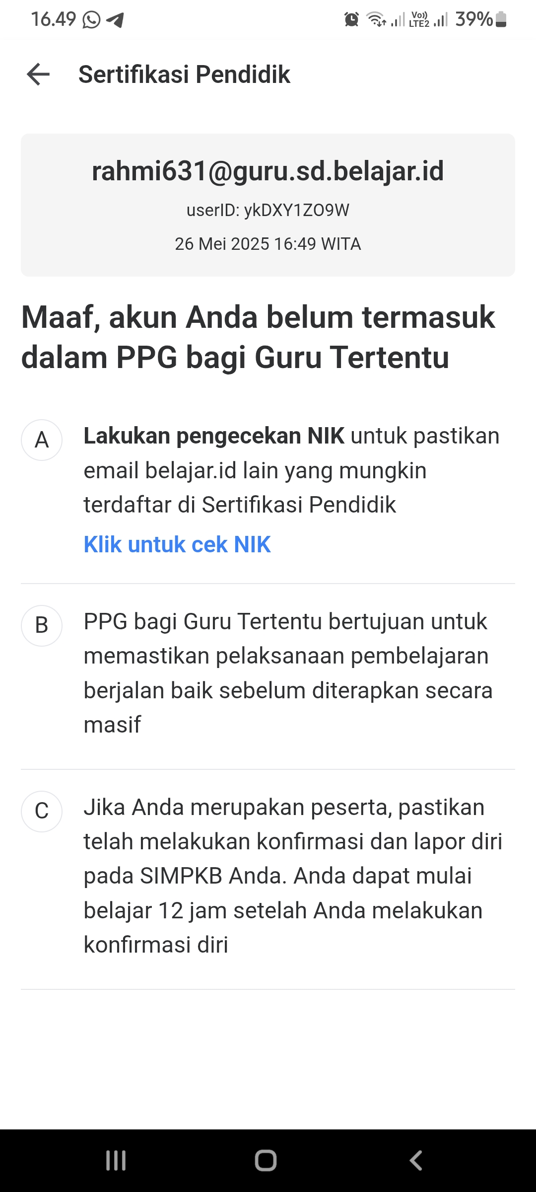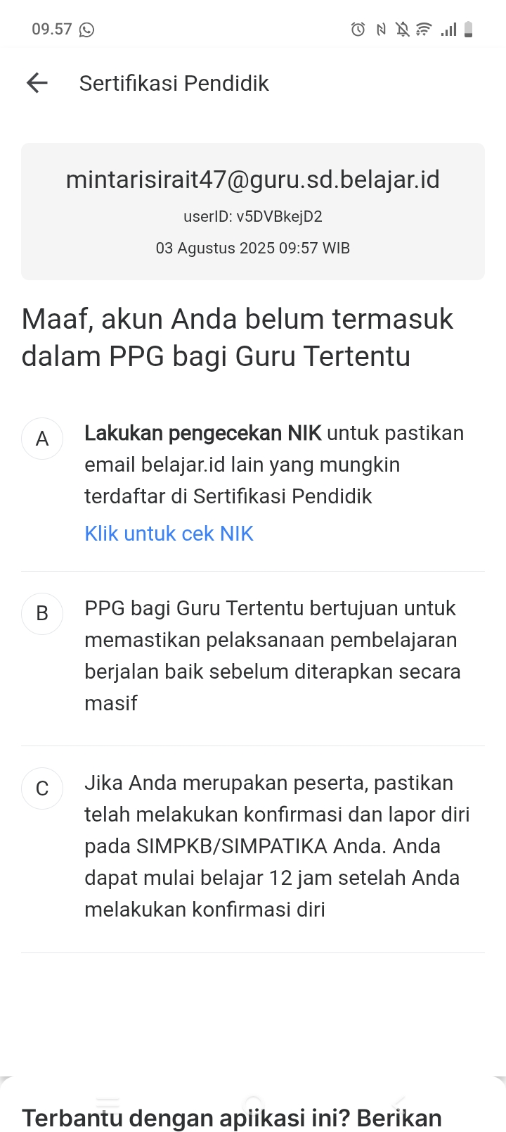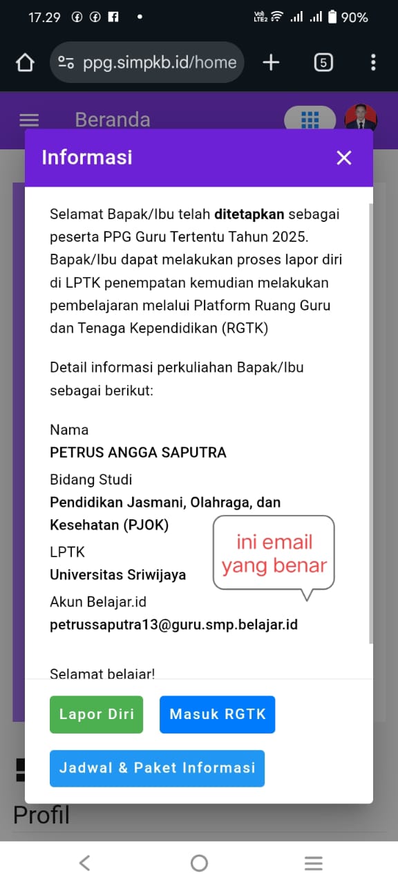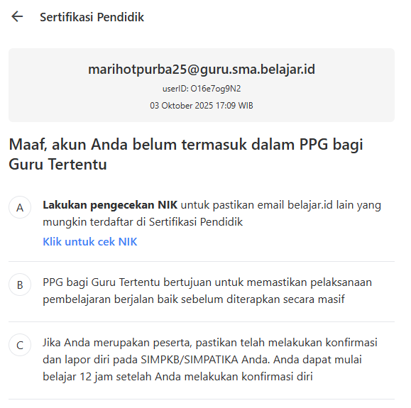 Saya terdaftar sebagai sasaran PPG Guru Tertentu tahun 2025, saya sudah melakukan lapor diri. Namun menu sertifikasi pendidik nya belum muncul karena email yg terdaftar berbeda dengan akun saya yang aktif.