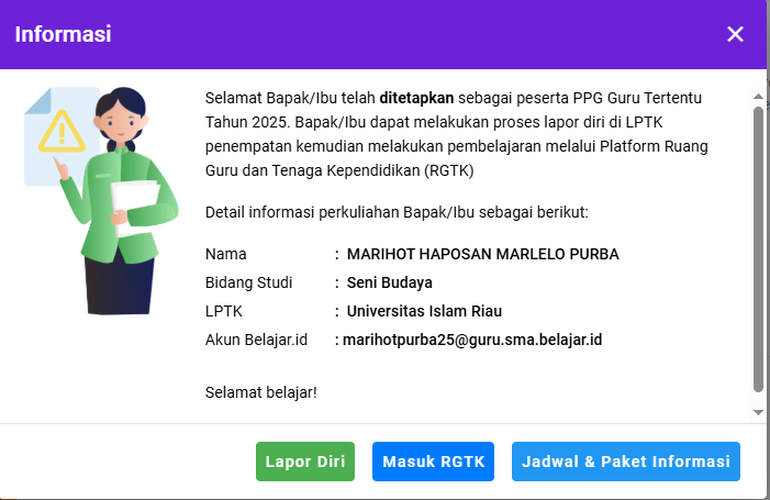 Namun, jika Anda merupakan peserta PPG bagi Guru Tertentu dan telah melakukan lapor diri tetapi masih mendapatkan notifikasi tersebut, silakan hubungi Pusat Bantuan Ruang GTK dengan melampirkan NIK serta akun yang digunakan untuk mengakses layanan Sertifikasi Pendidik.