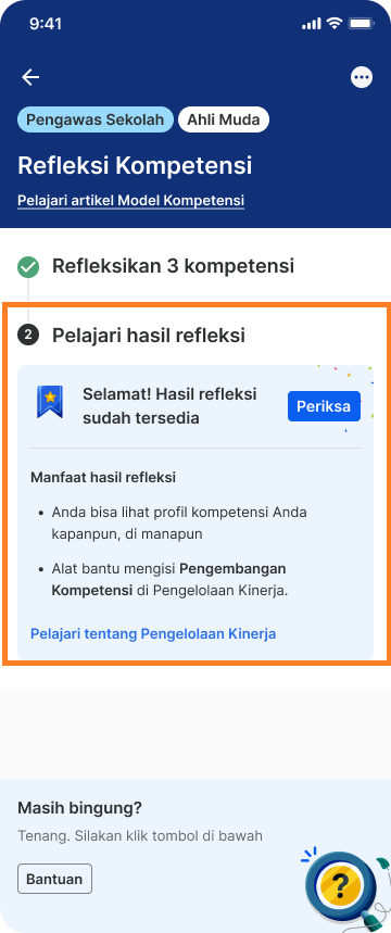 - Anda akan memperoleh hasil Refleksi Kompetensi yang terbagi menjadi dua kategori: Sudah baik dan Perlu ditingkatkan. Setiap kategori menunjukkan area kompetensi yang sudah dicapai dan yang masih perlu pengembangan.