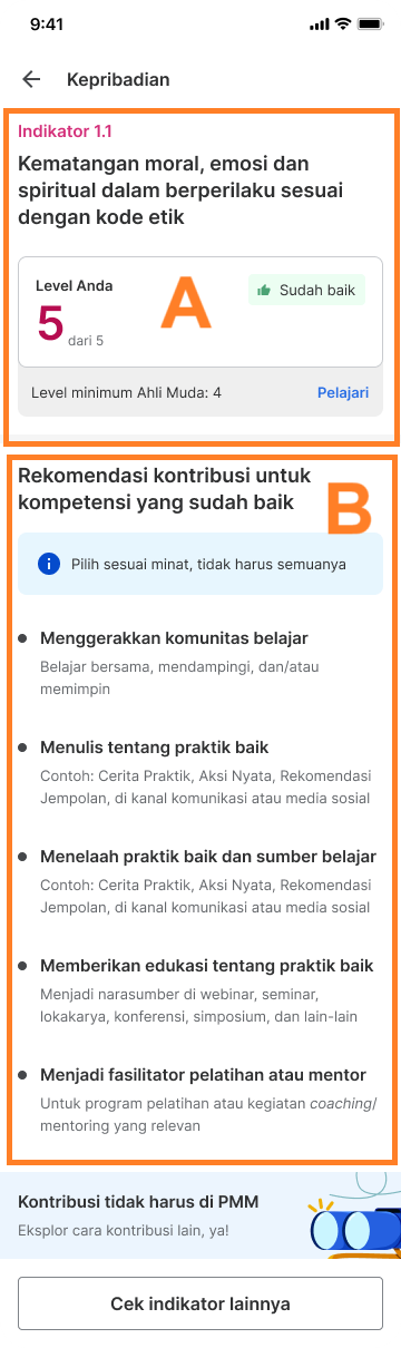 - Kategori Sudah baik menunjukkan bahwa Anda telah mencapai kompetensi yang kuat di area tersebut. Untuk mempertahankannya, Anda bisa terus memberikan kontribusi sesuai dengan rekomendasi yang diberikan.