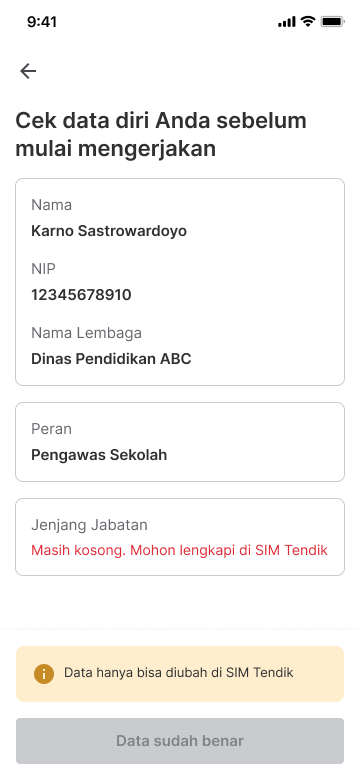 - Klik Tidak Sesuai, apabila Nama, NIP, Nama Lembaga, Peran dan Jenjang Jabatan tidak sesuai dengan data yang di tampilkan.