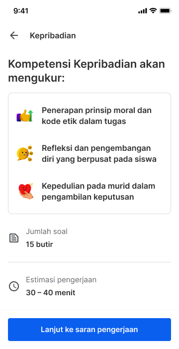 Klik tombol "Lanjut ke Saran Pengerjaan" untuk melihat panduan dan saran dalam menyelesaikan asesmen.