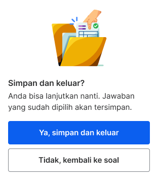 9. Selanjutnya, akan muncul halaman pertanyaan konfirmasi terkait asesmen yang sedang dikerjakan. Jika Anda ingin melanjutkan di lain waktu, Anda dapat mengklik Ya, simpan dan keluar, dan jawaban yang sudah dikerjakan akan tersimpan. Namun, jika Anda ingin melanjutkan menjawab soal asesmen, klik Kembali.
