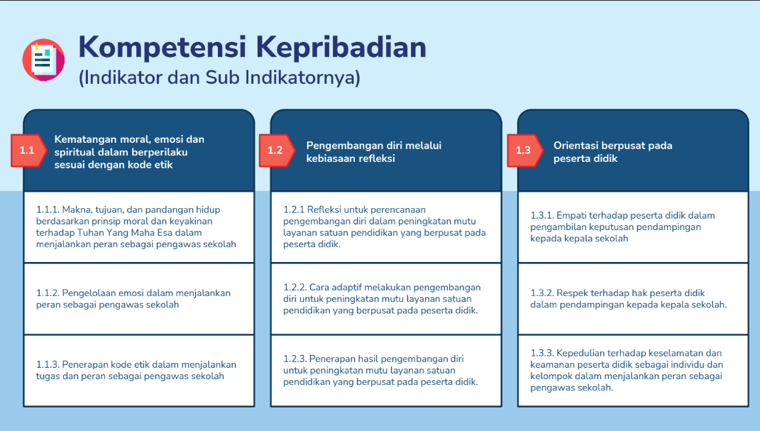 Kompetensi Kepribadian, yakni kemampuan Pengawas Sekolah dalam menunjukkan kualitas diri melalui kematangan moral, emosi, dan spiritual untuk berperilaku sesuai dengan kode etik, pengembangan diri melalui kebiasaan refleksi, dan memiliki orientasi berpusat pada peserta didik.