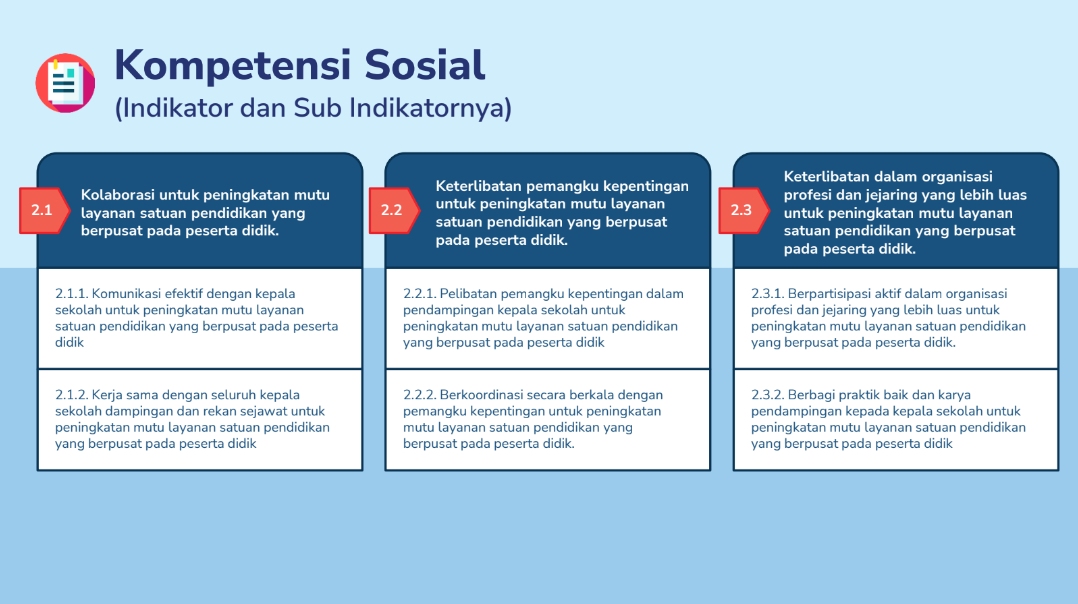 Kompetensi Sosial, yakni kemampuan Pengawas Sekolah berkolaborasi dengan kepala sekolah, rekan sejawat, dan masyarakat, serta keterlibatan dengan pemangku kepentingan, organisasi profesi, dan jejaring yang lebih luas untuk peningkatan mutu layanan satuan pendidikan yang berpusat pada peserta didik.