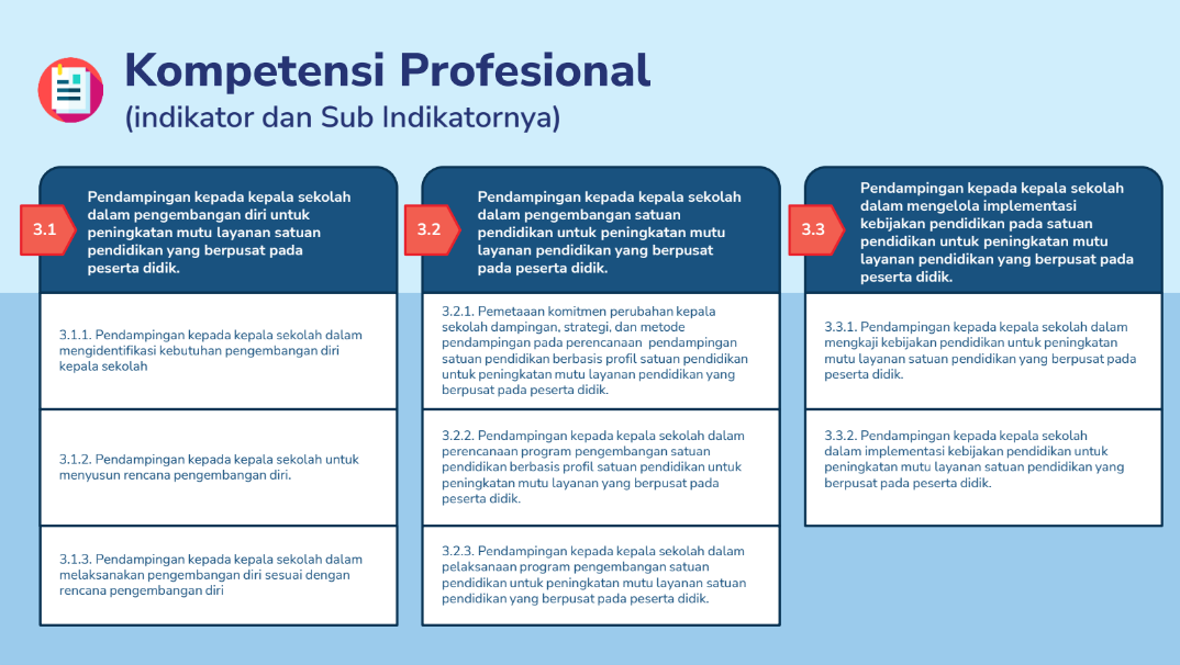 Uraian lengkap tingkat penguasaan kompetensi pada setiap sub-indikator dijabarkan dalam Kerangka Operasional Model Kompetensi Pengawas Sekolah yang dapat dilihat pada tautan berikut Panduan Operasional Model Kompetensi Pengawas Sekolah.